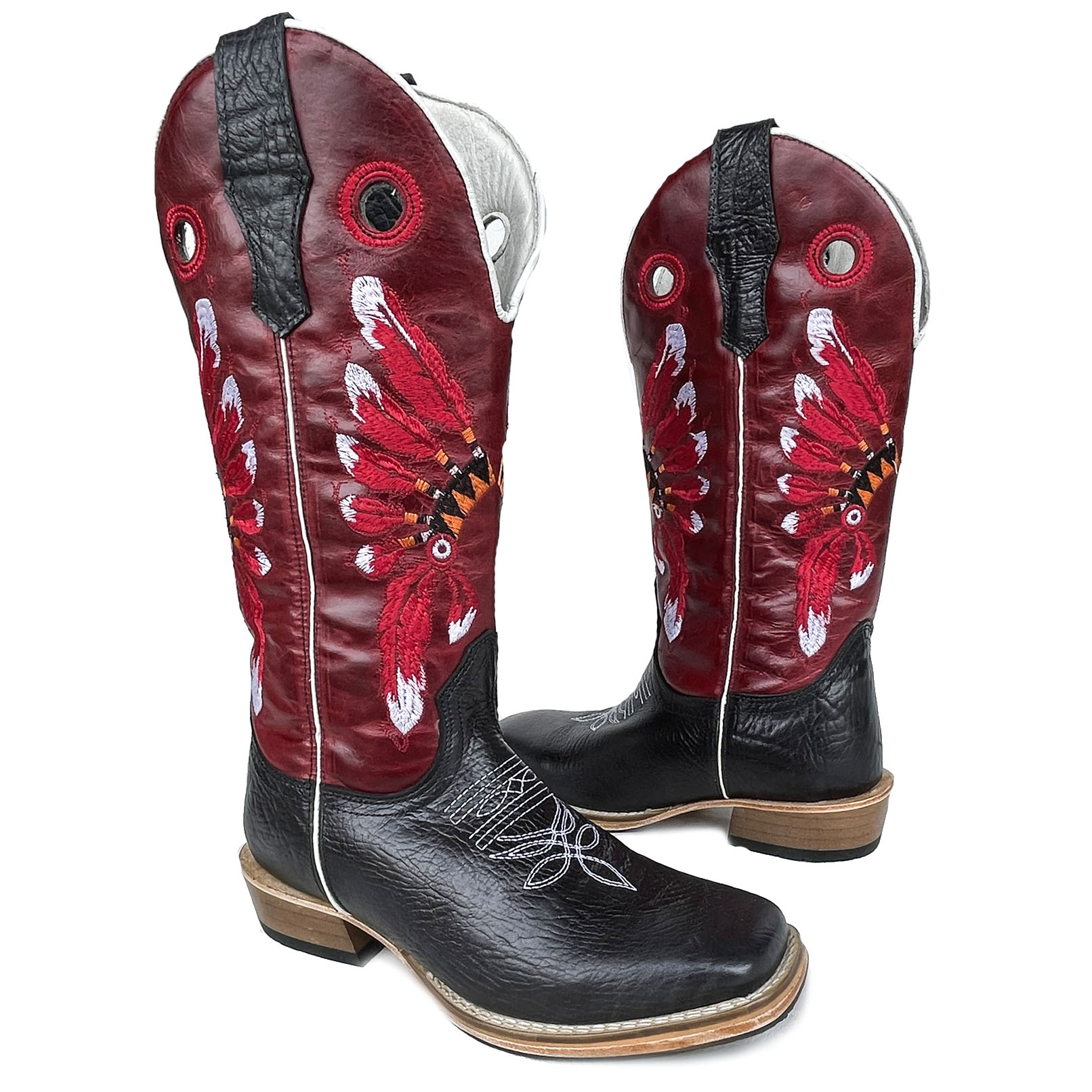 Bota Texana Cano Alto Preto Cocar Vermelho Carrapeta Bico Quadrado