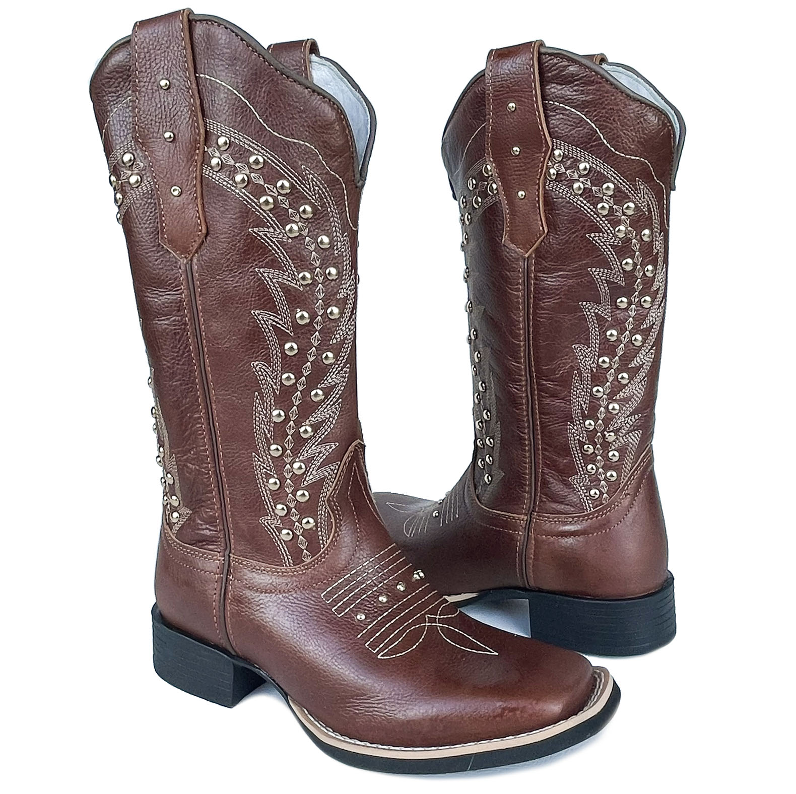 Bota Texana Feminina Café Bordado Com Strass Bico Quadrado